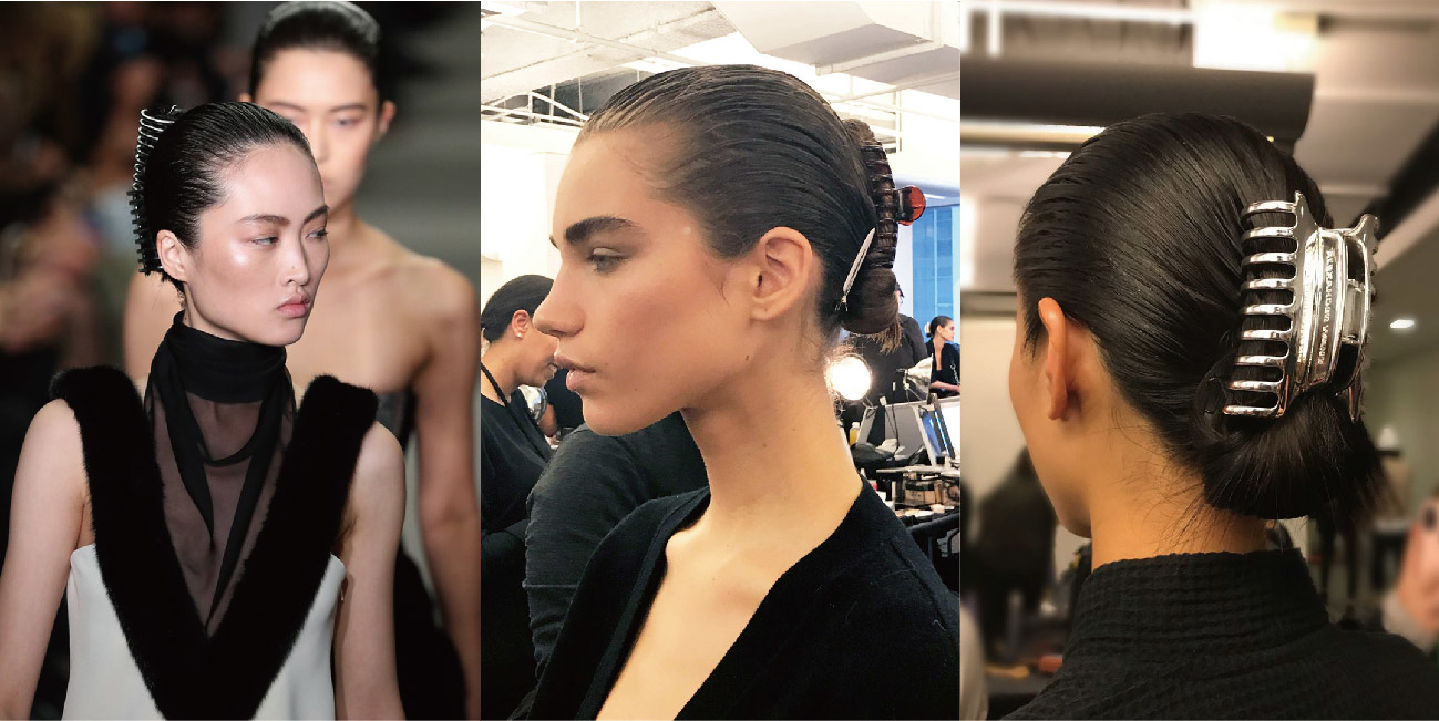從「包租婆」印象髮飾到「時裝周」最潮髮飾,在Alexander Wang 2018 Fall 的時裝周內,髮型師 Guido 再度把抓夾重新帶回了伸展台,這個髮型的意念來自 80 年代,他們首先用強力的定型噴霧把模特兒的頭髮綁成低馬尾再用抓夾將馬尾夾起,打造幹練俐落的造型,完全沒有老土感!讓金屬風格的抓夾掀起一陣熱潮!尤其是款式中偏小,具有金屬色澤的小抓夾!
