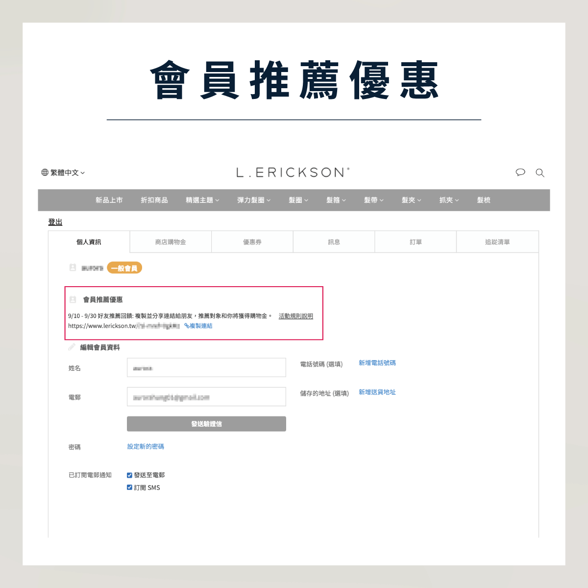 推薦人憑專屬連結推薦好友加入會員,新會員獎賞 $50 元購物金。