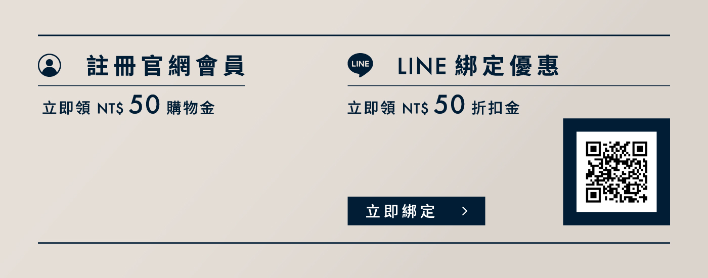 註冊官網會員,可獲得官網 NT$50 元購物金 (每筆訂單購物金使用上限為結帳金額10%) 。