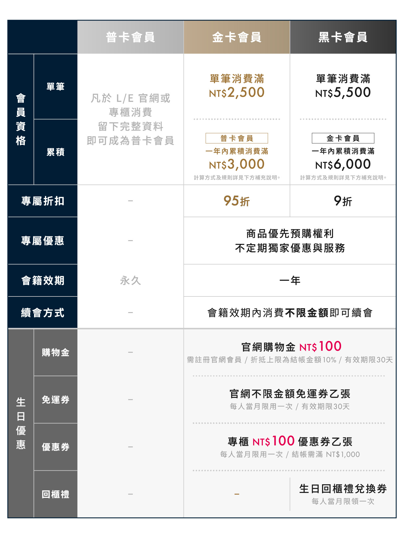 金卡會員:單筆消費滿 NT$2,500 元,或於成為普卡會員後一年內累積消費滿 NT$3,000 元。